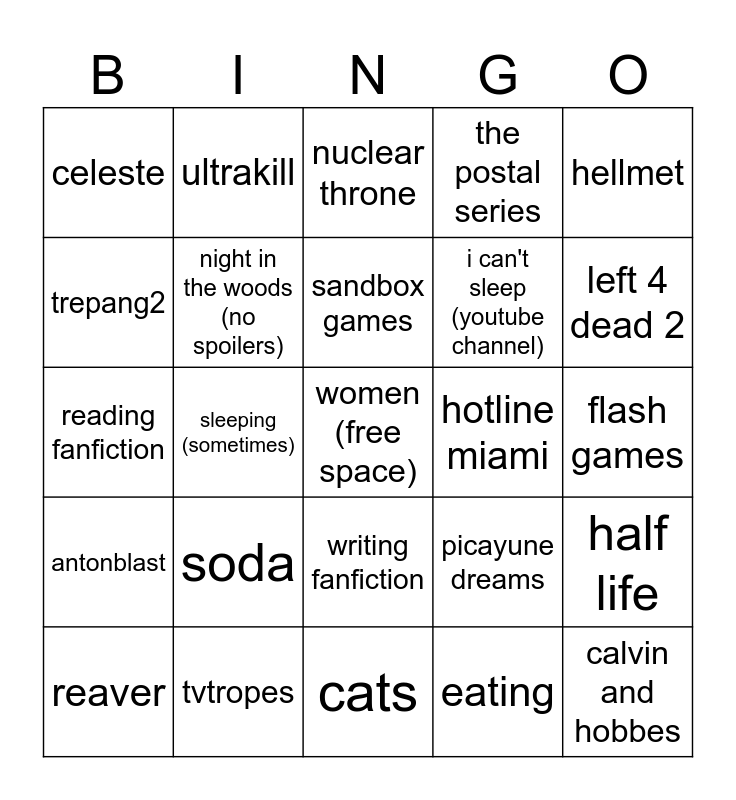 This bingo card has a free space and 24 words: soda, tvtropes, sandbox games, reaver, hellmet, celeste, trepang2, ultrakill, hotline miami, writing fanfiction, i can't sleep (youtube channel), reading fanfiction, picayune dreams, half life, night in the woods (no spoilers), eating, flash games, nuclear throne, left 4 dead 2, sleeping (sometimes), calvin and hobbes, antonblast, the postal series and cats.