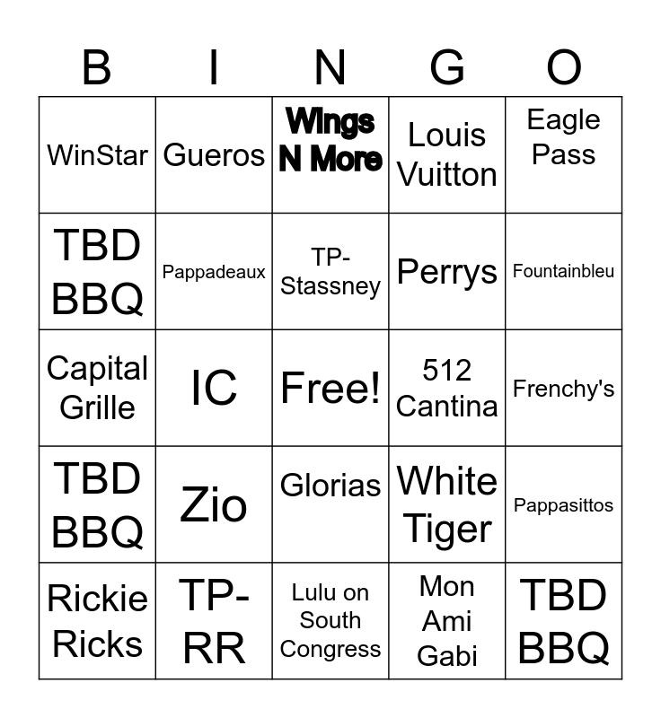 This bingo card has a free space and 24 words: Zio, TP-RR, TP-Stassney, Rickie Ricks, Eagle Pass, WinStar, TBD BBQ, Gueros, 512 Cantina, Glorias, Perrys, Capital Grille, White Tiger, Pappasittos, Pappadeaux, Mon Ami Gabi, Frenchy's, Wings N More, Fountainbleu, IC, TBD BBQ, TBD BBQ, Louis Vuitton and Lulu on South Congress.