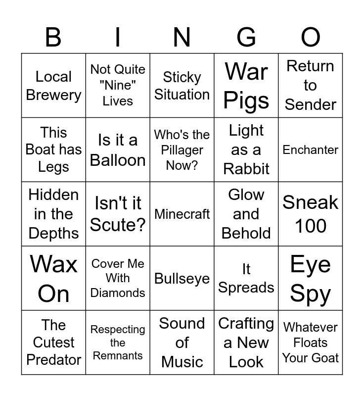 This bingo card has a free space and 24 words: Cover Me With Diamonds, Respecting the Remnants, Who's the Pillager Now?, The Cutest Predator, Return to Sender, Local Brewery, This Boat has Legs, Not Quite "Nine" Lives, Glow and Behold, Bullseye, Light as a Rabbit, Hidden in the Depths, It Spreads, Eye Spy, Is it a Balloon, Crafting a New Look, Sneak 100, Sticky Situation, Enchanter, Isn't it Scute?, Whatever Floats Your Goat, Wax On, War Pigs and Sound of Music.