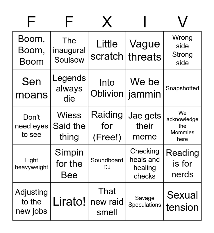 This bingo card has a free space and 24 words: Simpin for the Bee, Lirato!, Into Oblivion, Adjusting to the new jobs, Wrong side Strong side, Boom, Boom, Boom, Sen moans, The inaugural Soulsow, Jae gets their meme, Soundboard DJ, We be jammin, Don't need eyes to see, Checking heals and healing checks, Reading is for nerds, Legends always die, Savage Speculations, We acknowledge the Mommies here, Little scratch, Snapshotted, Wiess Said the thing, Sexual tension, Light heavyweight, Vague threats and That new raid smell.