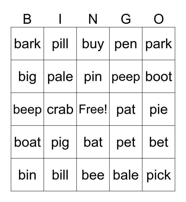 This bingo card has a free space and 24 words: pig, bill, pin, bin, park, bark, big, pill, pat, bat, peep, beep, pet, bet, pale, bale, pie, buy, boot, crab, pick, boat, pen and bee.