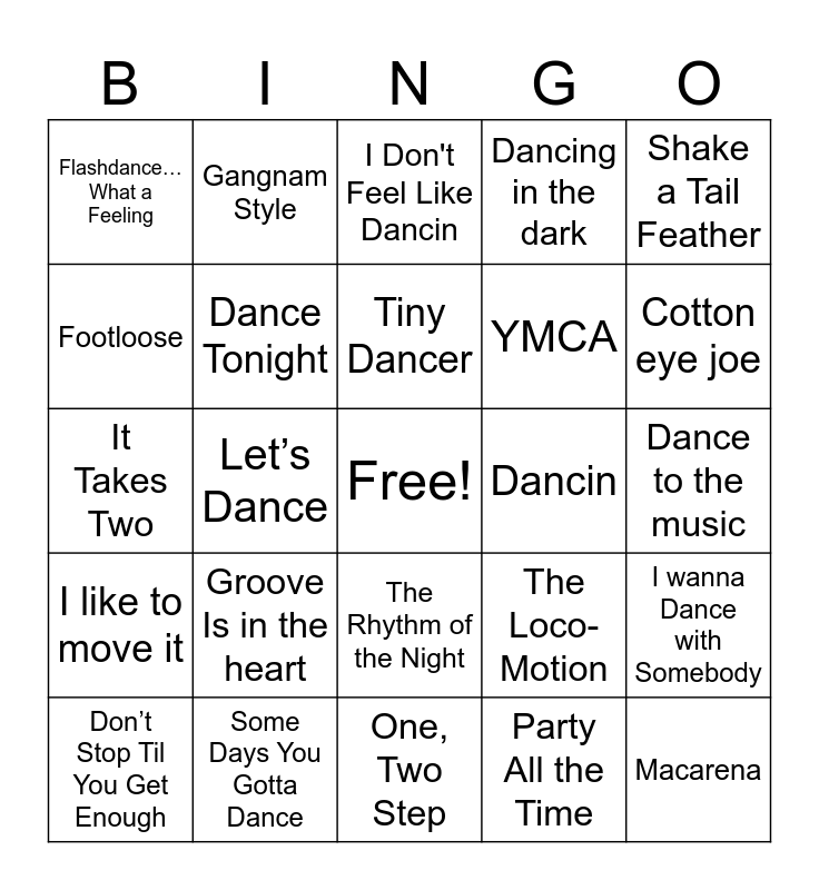 This bingo card has a free space and 67 words: Dancing Queen, Single Ladies, Walk Like An Egyptian, I wanna Dance with Somebody, Shut Up and Dance, Jump Around, Gangnam Style, Disco Inferno, Tiny Dancer, Dance The Night Away, The Rhythm of the Night, Dancing In The street, Dance to the music, Shake a Tail Feather, Don’t Stop Movin, Footloose, Let’s Dance, Flashdance… What a Feeling, Hips Don't Lie, YMCA, Groove Is in the heart, I like to move it, Dancing in the dark, Party All the Time, Rhythm Nation, This Is How We Do IT, Apache, U Cant Touch This, Cotton eye joe, Gettin’ Jetty Wit It, Macarena, Land of 1000 Dances, Electric Boogie, Into the Groove, Bust A Move, Don’t Stop Til You Get Enough, The Twist, The Loco- Motion, It Takes Two, Lets Dance, The Safety Dance, Dance Tonight, Dancin, Evacuate The Dancefloor, The Git Up, Neutron Dance, Hippy Hippy Shake, Some Days You Gotta Dance, Dancin’ the night away, Jump in the line, I Don't Feel Like Dancin, Freeze Frame, Tubthumping, Conga!, Shake your groove thing, One, Two Step, It’s Not Unusual, Thriller, The Hustle, Boot Scootin Boogie, Dance With ME, Born To Hand Jive, Last Dance, Mary Jane’s Last Dance, Save the last dance for me, Dance Apocalyptic and Why don't we just dance.
