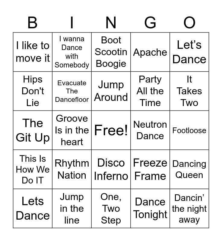 This bingo card has a free space and 63 words: Pump up the jam, Just Dance, Gonna Make You Sweat, Dancing Queen, Single Ladies, Walk Like An Egyptian, I wanna Dance with Somebody, Shut Up and Dance, Jump Around, Gangnam Style, Disco Inferno, Don’t Stop Movin, Footloose, Let’s Dance, Flashdance… What a Feeling, Hips Don't Lie, Groove Is in the heart, I like to move it, Dancing in the dark, Party All the Time, Rhythm Nation, This Is How We Do IT, Apache, U Cant Touch This, Cotton eye joe, Gettin’ Jetty Wit It, Macarena, Land of 1000 Dances, Electric Boogie, Into the Groove, Bust A Move, Don’t Stop Til You Get Enough, The Twist, The Loco- Motion, It Takes Two, Lets Dance, The Safety Dance, Dance Tonight, Dancin, Evacuate The Dancefloor, The Git Up, Neutron Dance, Hippy Hippy Shake, Some Days You Gotta Dance, Dancin’ the night away, Jump in the line, I Don't Feel Like Dancin, Freeze Frame, Tubthumping, Conga!, Shake your groove thing, One, Two Step, It’s Not Unusual, Thriller, The Hustle, Boot Scootin Boogie, Dance With ME, Born To Hand Jive, Last Dance, Mary Jane’s Last Dance, Save the last dance for me, Dance Apocalyptic and Why don't we just dance.