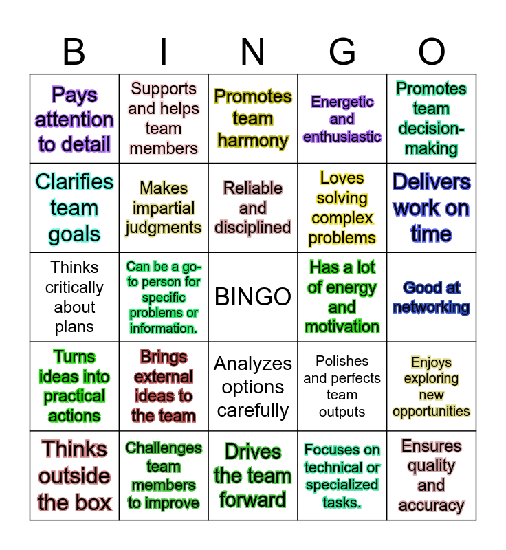 This bingo card has a free space and 24 words: Brings external ideas to the team, Challenges team members to improve, Reliable and disciplined, Thinks outside the box, Promotes team decision-making, Pays attention to detail, Clarifies team goals, Supports and helps team members, Has a lot of energy and motivation, Analyzes options carefully, Loves solving complex problems, Thinks critically about plans, Polishes and perfects team outputs, Enjoys exploring new opportunities, Makes impartial judgments, Focuses on technical or specialized tasks., Good at networking, Promotes team harmony, Delivers work on time, Can be a go-to person for specific problems or information., Ensures quality and accuracy, Turns ideas into practical actions, Energetic and enthusiastic and Drives the team forward.