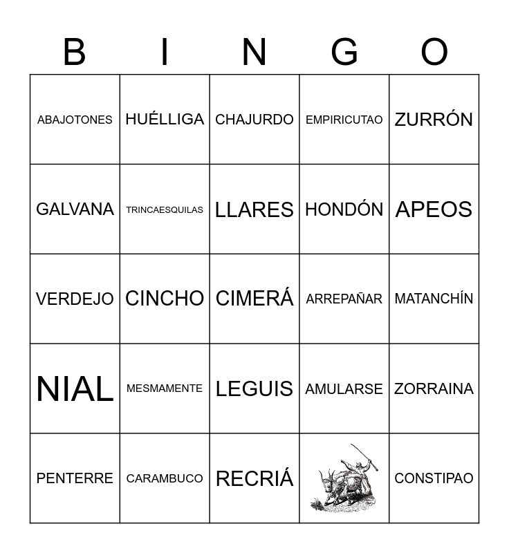 This bingo card has 5 images and 90 words: BURACO, CALVOTERO, CARAMBUCO, BORRAJO, CAZUELÁ, CHALABASCOS, CHASQUIZA, LÍA, LLARES, REMOLLÓN, ABAJOTONES, APEOS, BAJERÁ, BARRUFA, CALDÁ, CARPÍO, CHISPOLETO, DIJON, EMBAJOS, EMPIRICUTAO, GALVANA, PERO, HONDÓN, JUCHE, LOBÁS, MESMAMENTE, MIAJIRRINA, NEVARRUSCA, PANAERA, PENTERRE, PITA, RECRIÁ, RINGUNDANGOS, VERDEJO, ZARPAJO, ZORRAINA, CINCHO, LEGUIS, ZURRÓN, AMULARSE, ARREPAÑAR, CACHAR, CAVUCHAR, DESUÑIR, ASTAIZO, ANTOJINES, CHISPOLETO, CONSTIPAO, ESCOIMAO, GALDROBAS, IMPLAO, MAMBRÍAS, PELONCHO, PORRUDO, SIMBAI, TRINCAESQUILAS, VIOLERO, AMEAL, AMEALAR, AUREL, BRABÁN, BUJARDA, CANDELITA, CHAJURDO, CHÁPULES, CHIVERO, CHOZO, CIMERÁ, CORVEJÓN, CULITONTAS, ENSUBIAR, ESPARRERAR, GARGANTÓN, GUARÍN, HUÉLLIGA, HUESERA, LINDÓN, MANCORNAR, MANEA, MATANCHÍN, NIAL, PERIGOLLA, RABERO, RICIA, RIFLE, RUCIO, TACHÓN, TORNADERO, UÑIR and ZUMBA.