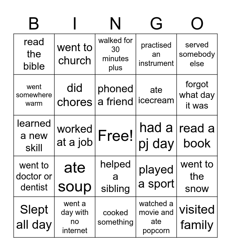 This bingo card has a free space and 24 words: Slept all day, ate soup, phoned a friend, watched a movie and ate popcorn, served somebody else, read the bible, went to church, walked for 30 minutes plus, had a pj day, read a book, learned a new skill, did chores, played a sport, went to the snow, went somewhere warm, went a day with no internet, cooked something, practised an instrument, forgot what day it was, went to doctor or dentist, worked at a job, helped a sibling, ate icecream and visited family.