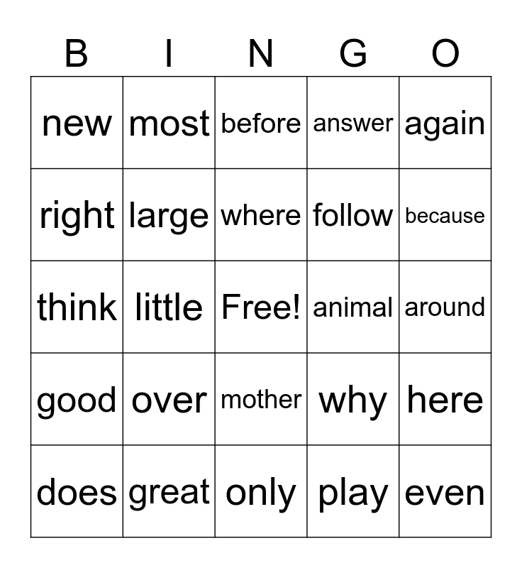 This bingo card has a free space and 24 words: over, great, where, does, again, new, right, most, animal, mother, follow, think, why, here, large, play, around, before, because, little, even, good, answer and only.