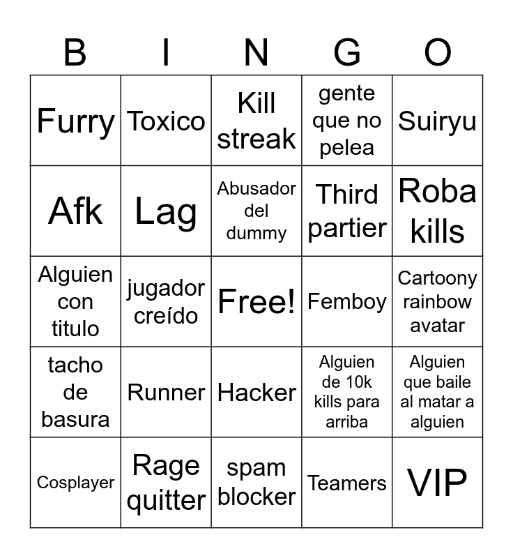 This bingo card has a free space and 24 words: Runner, Rage quitter, Abusador del dummy, Cosplayer, Suiryu, Furry, Afk, Toxico, Femboy, Hacker, Third partier, Alguien con titulo, Alguien de 10k kills para arriba, Alguien que baile al matar a alguien, Lag, Teamers, Cartoony rainbow avatar, Kill streak, Roba kills, jugador creído, VIP, tacho de basura, gente que no pelea and spam blocker.