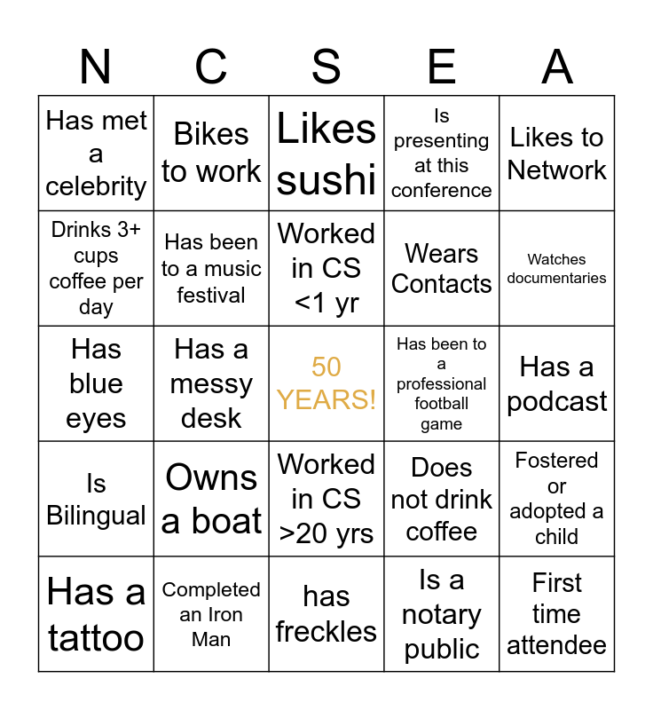 This bingo card has a free space and 67 words: Is Vegetarian, Attended a concert this year, Can drive stick-shift, Fostered or adopted a child, Currently pursuing a degree, Collects something, Bikes to work, Named after a relative, Worked in CS <1 yr, Is Left-handed, Worked in CS >20 yrs, Can hula hoop, Has a podcast, Likes to Network, Is a vendor, Drinks 3+ cups coffee per day, Has a messy desk, Has met a celebrity, Took/Takes dance lessons, Wears Contacts, Owns a boat, Is Bilingual, Is presenting at this conference, Is a notary public, Has visited at least 6 countries, Taught a class, Is an only child, Drove to the conference, Watches documentaries, Has zero emails in work "Inbox", First time attendee, Is a published author, Is double jointed, Ran a marathon, Has same birth month as you, Has a tattoo, Born in August, Does not drink coffee, Has blue eyes, Never gotten a speeding ticket, Was born outside of the United States, Has been to a music festival, Has been to a professional football game, Had a career outside of Child Support, Can code, Has an unusual pet, First NCSEA Conference, Completed an Iron Man, Was lead in a play, Has a favorite pen, Likes sushi, Has had stiches, Has been to all 50 states, Born the same month as you, like to wake up early, has freckles, can whistle a song, has curly hair, Has won a food eating contest, Hates onions, has 2 or more siblings, wearing blue, wears glasses, likes to play soccer, Cannot swim, From the Midwest and Drives a motorcycle.