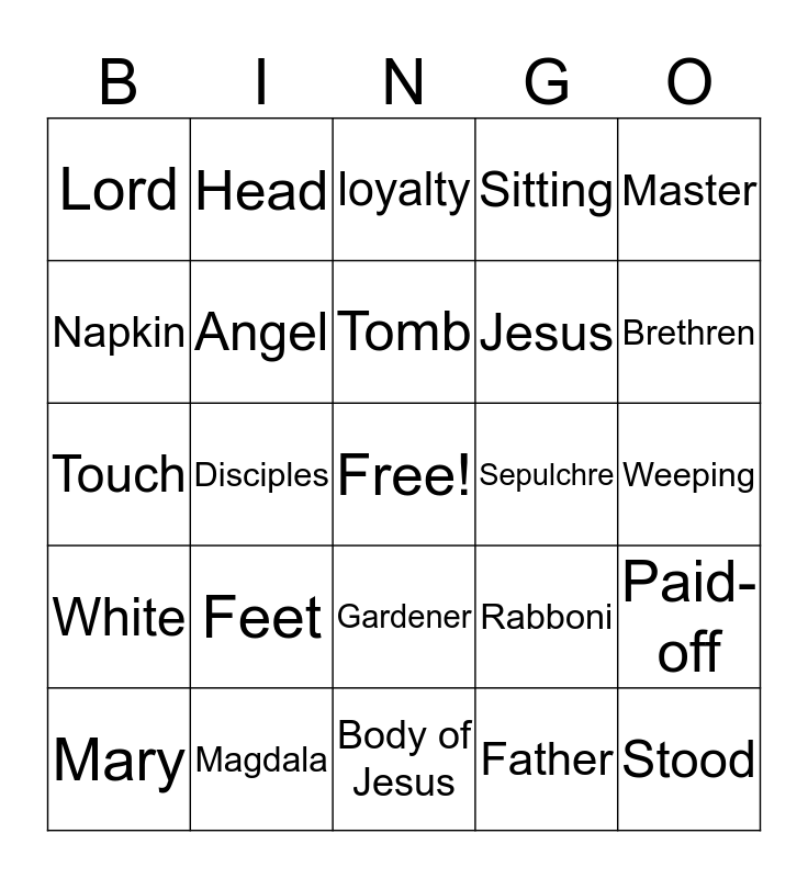 This bingo card has a free space and 24 words: Feet, Magdala, Tomb, Mary, Master, Lord, Napkin, Head, Sepulchre, Gardener, Jesus, Touch, Rabboni, Paid-off, Angel, Father, Weeping, loyalty, Brethren, Disciples, Stood, White, Sitting and Body of Jesus.