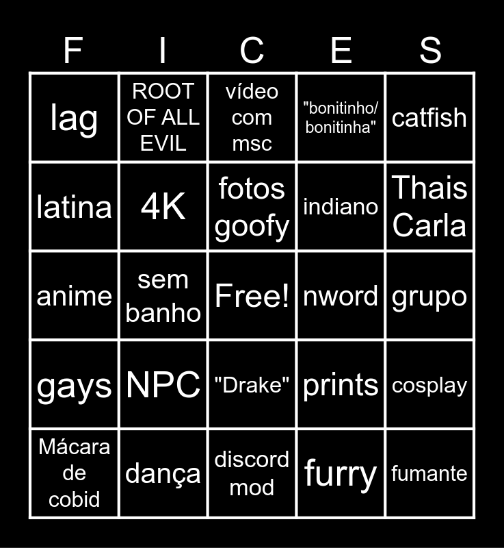 This bingo card has a free space and 52 words: TESTA GRANDE, fumante, average bri'ish, discord mod, NPC, egirl/eboy, ROOT OF ALL EVIL, espelho sujo, latina, femboy, 4K, foto sexualizada.., cosplay, prints, animais, tapar a fuça, fotos goofy, nword, alterno/ alterna, catfish, sem banho, furry, lag, indiano, comedor de gatos, WTF, idoso, criança, Thais Carla, quarto desarrumado, filtros, "bonitinho/ bonitinha", sigma, doppleganger, foto do olho, vídeo com msc, dança, ganza/ zaza, rico, branco d+, duos, grupo, gays, lésbicas, "Drake", Óclinhos, corte goofy, anime, gaymer, KURWA/ SUKA, Mácara de cobid and betinho de cascais.
