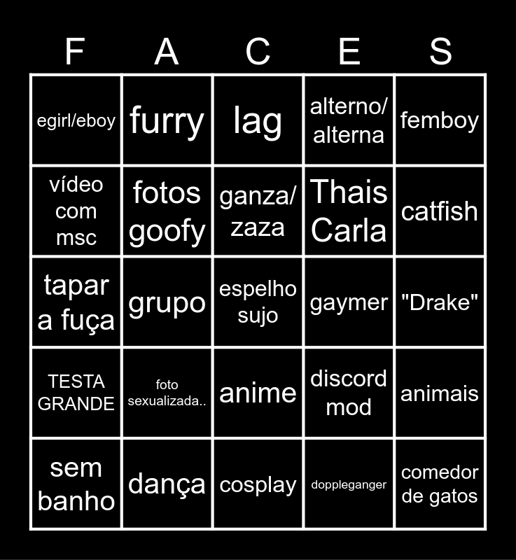 This bingo card has 53 words: Free!, TESTA GRANDE, fumante, average bri'ish, discord mod, NPC, egirl/eboy, ROOT OF ALL EVIL, espelho sujo, latina, femboy, 4K, foto sexualizada.., cosplay, prints, animais, tapar a fuça, fotos goofy, nword, alterno/ alterna, catfish, sem banho, furry, lag, indiano, comedor de gatos, WTF, idoso, criança, Thais Carla, quarto desarrumado, filtros, "bonitinho/ bonitinha", sigma, doppleganger, foto do olho, vídeo com msc, dança, ganza/ zaza, rico, branco d+, duos, grupo, gays, lésbicas, "Drake", Óclinhos, corte goofy, anime, gaymer, KURWA/ SUKA, Mácara de cobid and betinho de cascais.