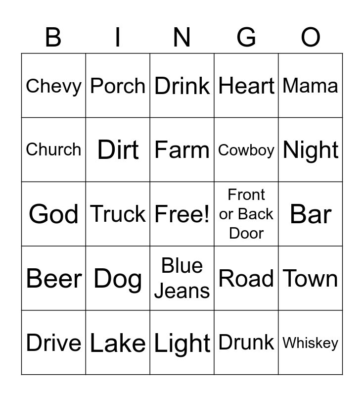 This bingo card has a free space and 31 words: Light, Boots, Truck, Girl, Chevy, Drink, Dirt, Road, Front or Back Door, Drunk, Bar, Whiskey, Radio, Prayer, Night, America, Town, Dog, Beer, Blue Jeans, Mama, Love, Drive, Porch, Cowboy, Church, Heart, God, Lake, Farm and Daddy.