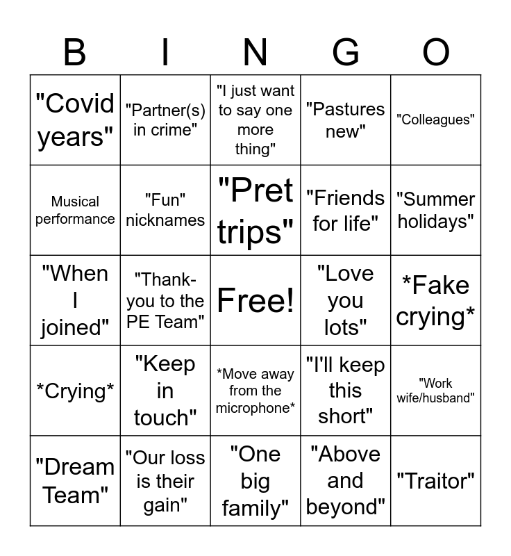 This bingo card has a free space and 29 words: "Dream Team", "ECTs & Mentors", "Thank-you to the PE Team", *Forced Laughter*, "Covid years", "I just want to say one more thing", "Fun" nicknames, "Keep in touch", "Love you lots", "Our loss is their gain", *Fake crying*, "Traitor", "One big family", "Above and beyond", "Summer holidays", "1GHC", *Move away from the microphone*, *Crying*, "Colleagues", "When I joined", "I'll keep this short", "Can you hear me?", "Friends for life", Musical performance, "Pastures new", "Partner(s) in crime", "Work wife/husband", "Pret trips" and "Truly comprehensive".