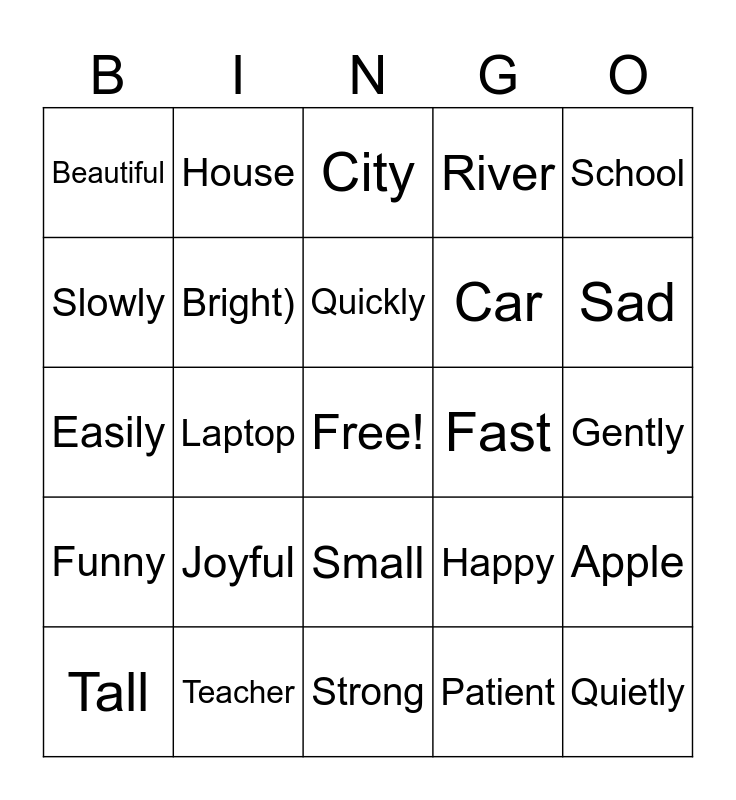 This bingo card has a free space and 24 words: Joyful, Teacher, Quickly, Tall, School, Beautiful, Slowly, House, Fast, Small, Car, Easily, Happy, Apple, Bright), Patient, Gently, City, Sad, Laptop, Quietly, Funny, River and Strong.