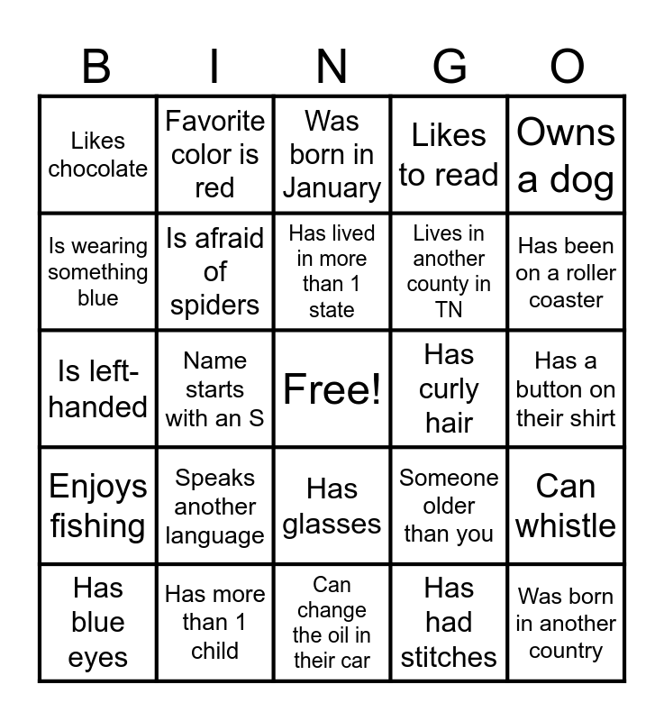 This bingo card has a free space and 24 words: Speaks another language, Has more than 1 child, Has lived in more than 1 state, Has blue eyes, Owns a dog, Likes chocolate, Is wearing something blue, Favorite color is red, Has curly hair, Has glasses, Lives in another county in TN, Is left-handed, Someone older than you, Can whistle, Is afraid of spiders, Has had stitches, Has a button on their shirt, Was born in January, Has been on a roller coaster, Name starts with an S, Was born in another country, Enjoys fishing, Likes to read and Can change the oil in their car.