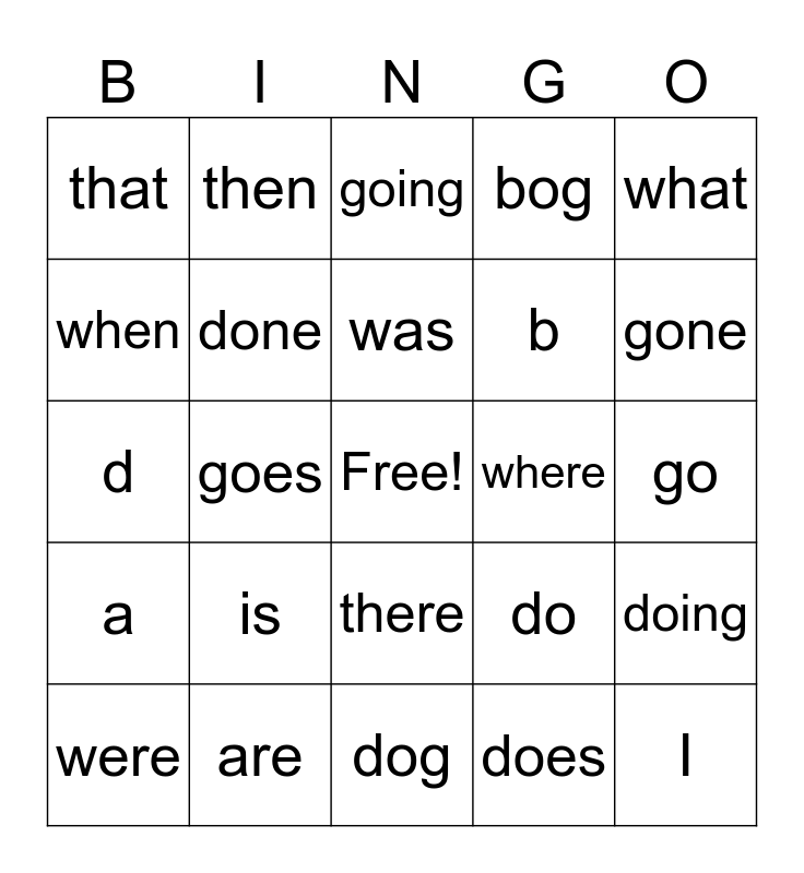 This bingo card has a free space and 24 words: is, are, was, were, what, that, when, then, where, there, b, d, do, doing, done, does, go, going, gone, goes, I, a, bog and dog.