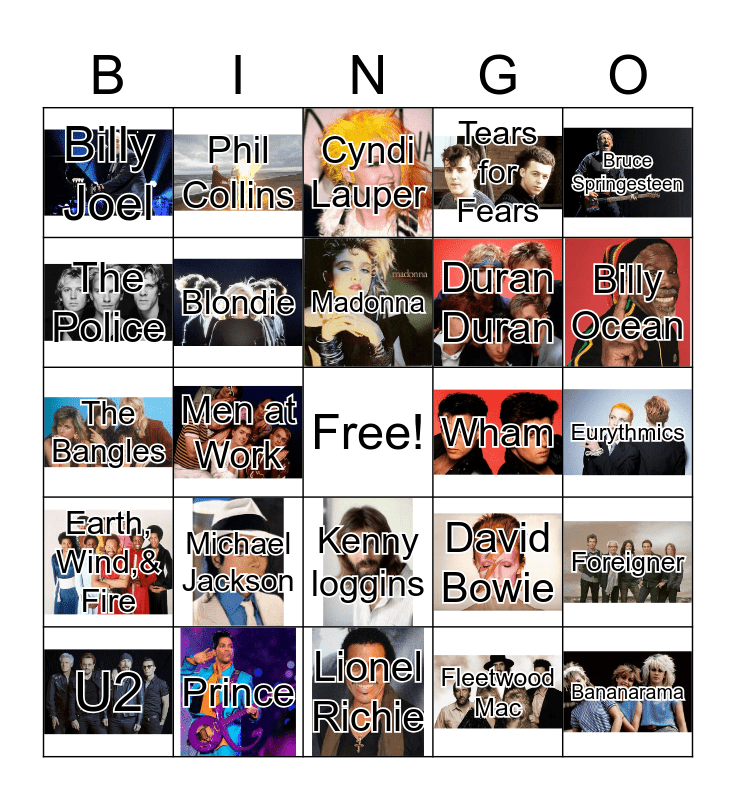 This bingo card has 24 images, a free space and 24 words: Michael Jackson, Prince, Madonna, U2, Bruce Springesteen, Billy Joel, The Police, Phil Collins, Wham, Kenny loggins, Duran Duran, The Bangles, David Bowie, Foreigner, Blondie, Fleetwood Mac, Eurythmics, Cyndi Lauper, Billy Ocean, Men at Work, Bananarama, Earth, Wind,& Fire, Tears for Fears and Lionel Richie.