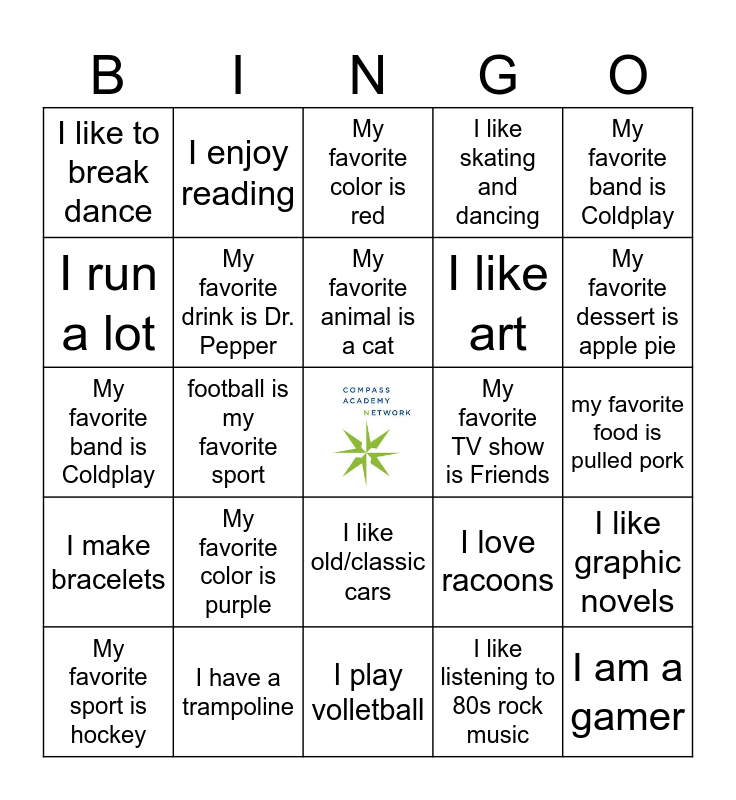 This bingo card has a free space and 24 words: My favorite color is purple, I have a trampoline, My favorite animal is a cat, My favorite sport is hockey, My favorite band is Coldplay, I like to break dance, I run a lot, I enjoy reading, My favorite TV show is Friends, I like old/classic cars, I like art, My favorite band is Coldplay, I love racoons, I like graphic novels, My favorite drink is Dr. Pepper, I like listening to 80s rock music, my favorite food is pulled pork, My favorite color is red, My favorite dessert is apple pie, football is my favorite sport, I am a gamer, I make bracelets, I like skating and dancing and I play volletball.
