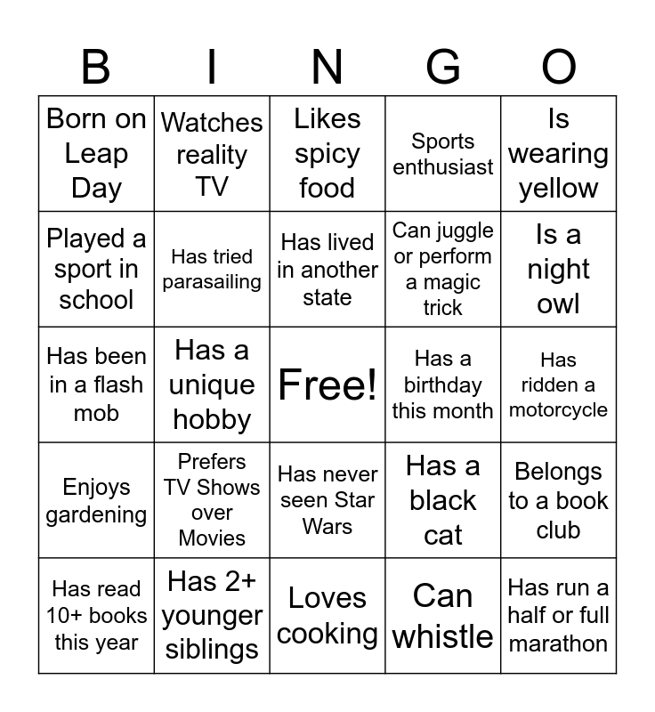 This bingo card has a free space and 24 words: Prefers TV Shows over Movies, Has 2+ younger siblings, Has lived in another state, Has read 10+ books this year, Is wearing yellow, Born on Leap Day, Played a sport in school, Watches reality TV, Has a birthday this month, Has never seen Star Wars, Can juggle or perform a magic trick, Has been in a flash mob, Has a black cat, Belongs to a book club, Has tried parasailing, Can whistle, Has ridden a motorcycle, Likes spicy food, Is a night owl, Has a unique hobby, Has run a half or full marathon, Enjoys gardening, Sports enthusiast and Loves cooking.