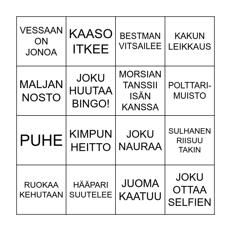 This bingo card has 16 words: HÄÄPARI SUUTELEE, SULHANEN RIISUU TAKIN, BESTMAN VITSAILEE, VESSAAN ON JONOA, PUHE, KAASO ITKEE, JOKU NAURAA, JUOMA KAATUU, MALJAN NOSTO, JOKU HUUTAA BINGO!, RUOKAA KEHUTAAN, KAKUN LEIKKAUS, KIMPUN HEITTO, POLTTARI-MUISTO, MORSIAN TANSSII ISÄN KANSSA and JOKU OTTAA SELFIEN.