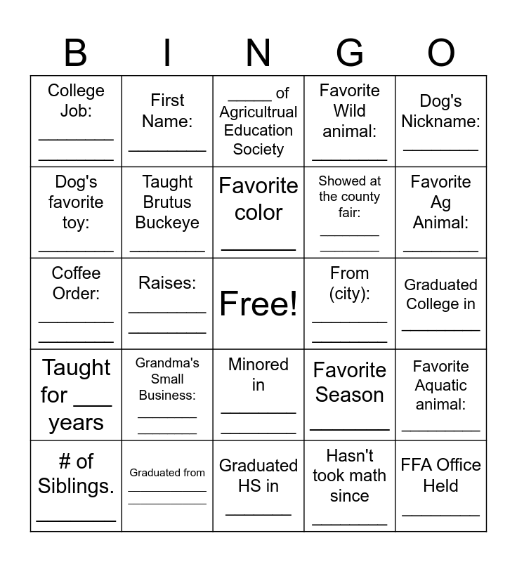 This bingo card has a free space and 30 words: Graduated from _____________ _____________, Teaches: ________ ________, Raises: ________ ________, Dogs Name: _______, College Job: ________ ________, _____ of Agricultrual Education Society, Taught Brutus Buckeye ________, Minored in ________ ________, From (city): ________ ________, Graduated HS in _______, Graduated College in _________, FFA Office Held ________, Hasn't took math since ________, Favorite Show: ______, Favorite Ag Animal: ________, Favorite Holiday _______, Favorite Season _______, Taught for ___ years, Grandma's Small Business: ________ ________, Dog's Nickname: ________, Coffee Order: ________ ________, College Major: ________ ________, First Name: ________, Showed at the county fair: ________ ________, Dog's favorite toy: ________, Favorite Wild animal: ________, Favorite Aquatic animal: _________, # of Siblings. _______, Favorite color ______ and Involved in 4-H at _____ level..