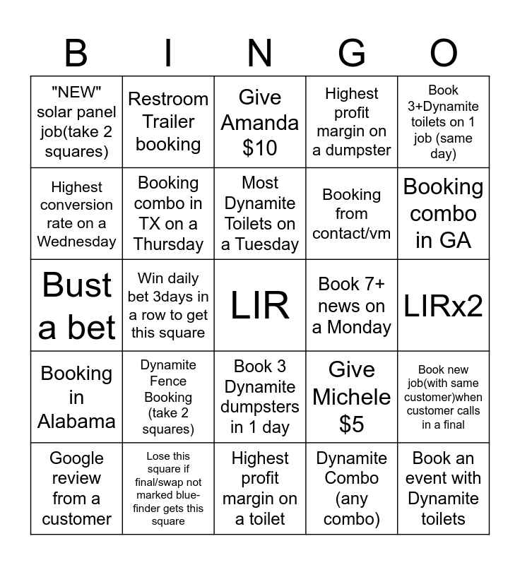 This bingo card has a free space and 24 words: Dynamite Fence Booking (take 2 squares), Lose this square if final/swap not marked blue-finder gets this square, Most Dynamite Toilets on a Tuesday, Google review from a customer, Book 3+Dynamite toilets on 1 job (same day), "NEW" solar panel job(take 2 squares), Highest conversion rate on a Wednesday, Restroom Trailer booking, Book 7+ news on a Monday, Book 3 Dynamite dumpsters in 1 day, Booking from contact/vm, Bust a bet, Give Michele $5, Book new job(with same customer)when customer calls in a final, Booking combo in TX on a Thursday, Dynamite Combo (any combo), LIRx2, Give Amanda $10, Booking combo in GA, Win daily bet 3days in a row to get this square, Book an event with Dynamite toilets, Booking in Alabama, Highest profit margin on a dumpster and Highest profit margin on a toilet.