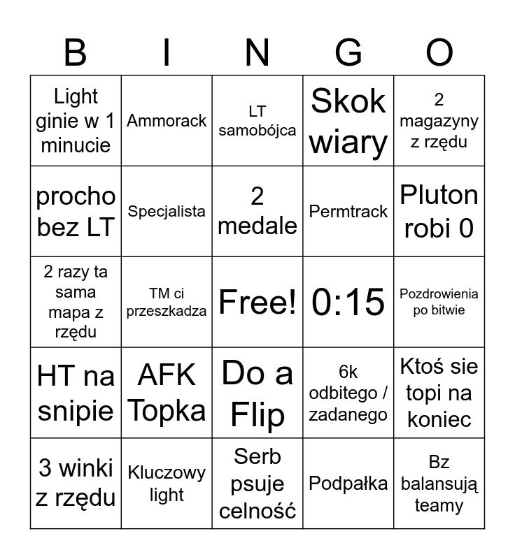 This bingo card has a free space and 27 words: 6k odbitego / zadanego, Arta pracuje we mnie, Permtrack, Serb psuje celność, procho bez LT, LT samobójca, Ammorack, HT na snipie, 0:15, Ktoś sie topi na koniec, 2 razy ta sama mapa z rzędu, Skok wiary, 3 winki z rzędu, Kluczowy light, Pluton robi 0, Kluczowy Cap, Specjalista, 2 medale, AFK Topka, Light ginie w 1 minucie, Pozdrowienia po bitwie, Podpałka, TM ci przeszkadza, Bz balansują teamy, Do a Flip, 2 magazyny z rzędu and Sojusznik rozbija się.