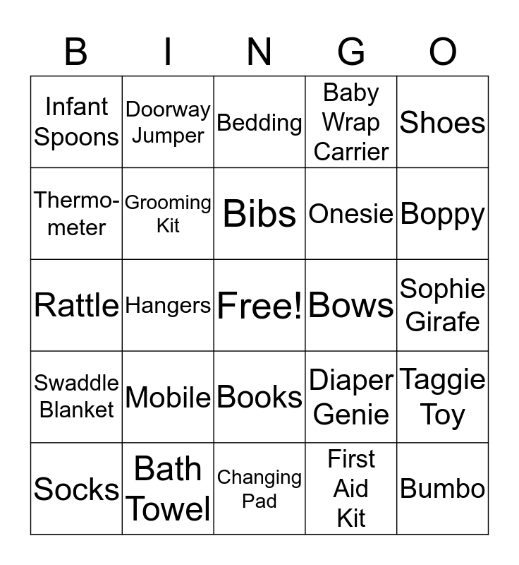This bingo card has a free space and 24 words: Mobile, Bath Towel, Bibs, Socks, Shoes, Infant Spoons, Thermo-meter, Doorway Jumper, Bows, Books, Onesie, Rattle, Diaper Genie, Taggie Toy, Grooming Kit, First Aid Kit, Sophie Girafe, Bedding, Boppy, Hangers, Bumbo, Swaddle Blanket, Baby Wrap Carrier and Changing Pad.