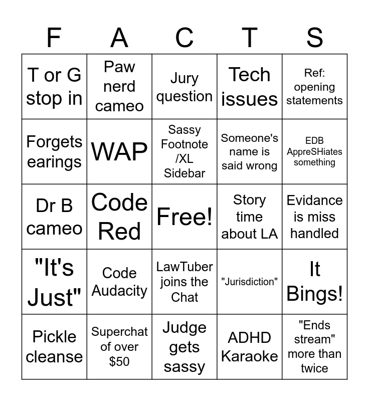 This bingo card has a free space and 28 words: It Bings!, Womp there it is!, Someone's name is said wrong, ADHD Karaoke, Forgets earings, Jury question, Paw nerd cameo, "It's Just", Story time about LA, Pickle cleanse, Dr B cameo, Tech issues, Superchat of over $50, Judge gets sassy, EDB AppreSHiates something, Goat Screams, Code Audacity, WAP, Sassy Footnote /XL Sidebar, LawTuber joins the Chat, T or G stop in, Legal word defined, "Ends stream" more than twice, Code Red, Evidance is miss handled, "Jurisdiction", Ref: opening statements and Fuckery afoot.