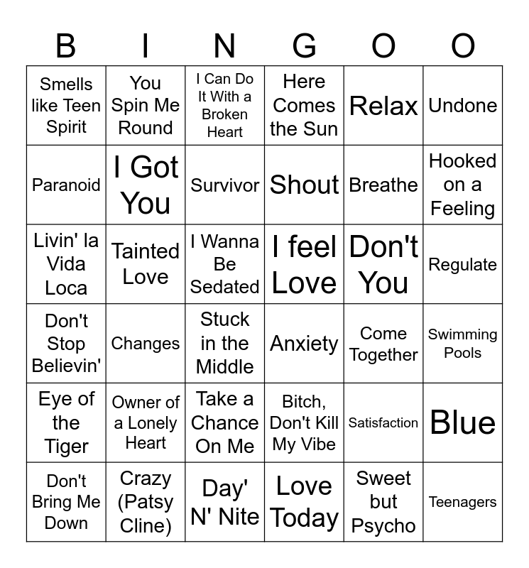 This bingo card has 39 words: Crazy (Patsy Cline), Don't Bring Me Down, Superstition, Paranoid, Stuck in the Middle, Regulate, I Got You, Teenagers, Relax, I feel Love, Hooked on a Feeling, Here Comes the Sun, Livin' la Vida Loca, I Wanna Be Sedated, Tainted Love, Don't You, Satisfaction, Smells like Teen Spirit, Day' N' Nite, Don't Stop Believin', Undone, Come Together, Survivor, Shout, Love Today, Take a Chance On Me, Eye of the Tiger, Sweet but Psycho, Owner of a Lonely Heart, You Spin Me Round, Crazy (Gnarls Barkley), Blue, I Can Do It With a Broken Heart, Anxiety, Swimming Pools, Bitch, Don't Kill My Vibe, Changes, Breathe and Fighter.