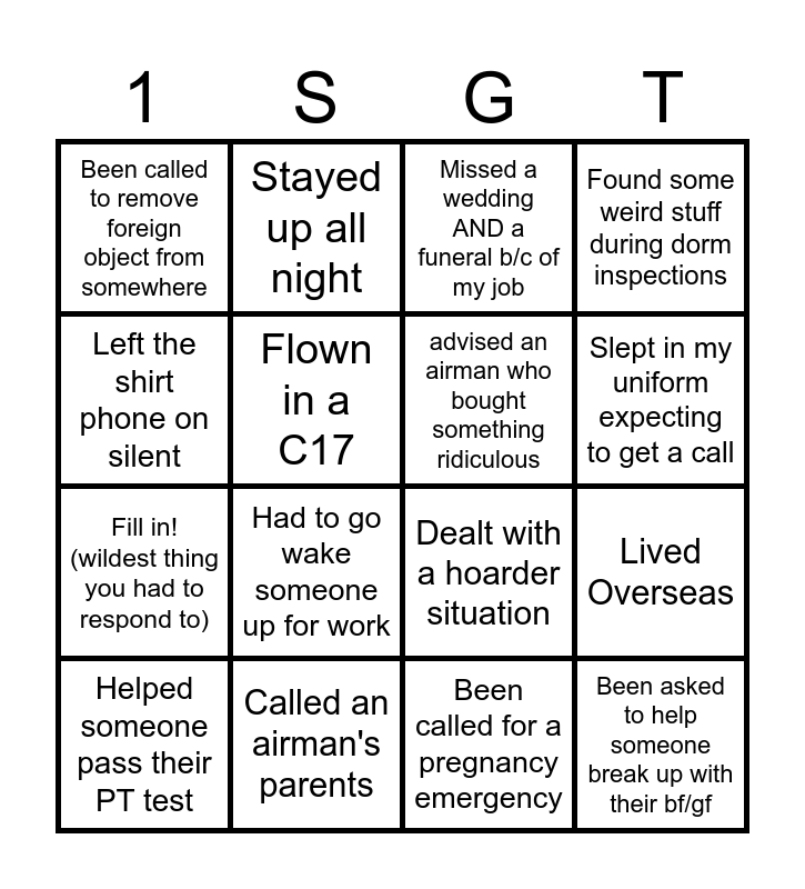 This bingo card has 20 words: Lived Overseas, Found a sock or undies stuck inside my ABUs, Missed a wedding AND a funeral b/c of my job, Flown in a C5, Helped someone pass their PT test, Left the shirt phone on silent, Called an airman's parents, Been called to remove foreign object from somewhere, Fill in! (wildest thing you had to respond to), Stayed up all night, Had to go wake someone up for work, Dealt with a hoarder situation, Flown in a C17, Been asked to help someone break up with their bf/gf, advised an airman who bought something ridiculous, Had to remove unusual pets, Slept in my uniform expecting to get a call, Found some weird stuff during dorm inspections, Been called for a pregnancy emergency and Helped someone do their laundry.