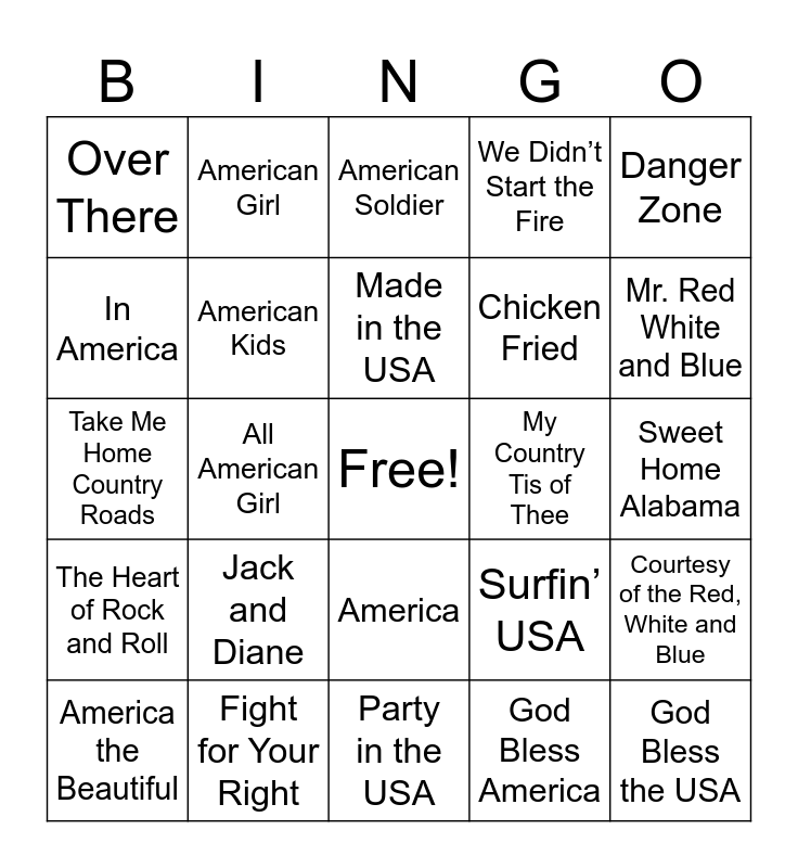This bingo card has a free space and 45 words: American Pie, God Bless the USA, Star Spangled Banner, America the Beautiful, Born in the USA, God Bless America, American Soldier, Home, Danger Zone, Fight for Your Right, We Didn’t Start the Fire, My Country Tis of Thee, America, Jack and Diane, Philadelphia Freedom, Party in the USA, American Oxygen, Take Me Home Country Roads, Fly Like an Eagle, Mr. Red White and Blue, American Girl, American Woman, The Stars and Stripes Forever, Over There, You’re a Grand Old Flag, Sweet Home Alabama, Yankee Doodle Dandy, Free Bird, Surfin’ USA, The Heart of Rock and Roll, California Dreamin’, Courtesy of the Red, White and Blue, Freedom, R.O.C.K. in the USA, Firework, All American Girl, Living in America, Burning Heart, Life is a Highway, Made in the USA, In America, Chicken Fried, Color Me America, American Kids and This Land is Your Land.