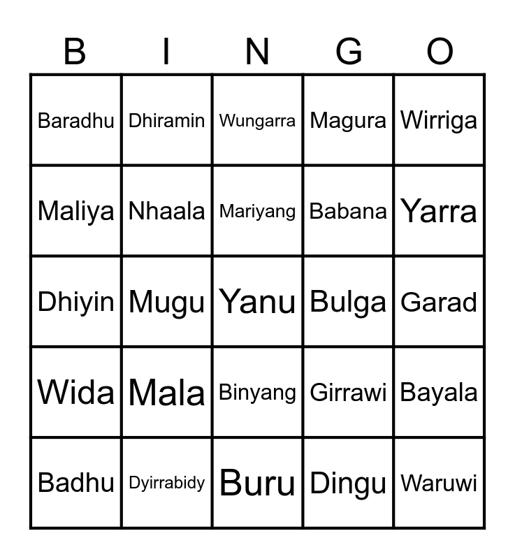 This bingo card has a free space and 24 words: Mala, Dyirrabidy, Mariyang, Badhu, Wirriga, Baradhu, Maliya, Dhiramin, Bulga, Binyang, Babana, Dhiyin, Girrawi, Bayala, Nhaala, Dingu, Garad, Wungarra, Yarra, Mugu, Waruwi, Wida, Magura and Buru.