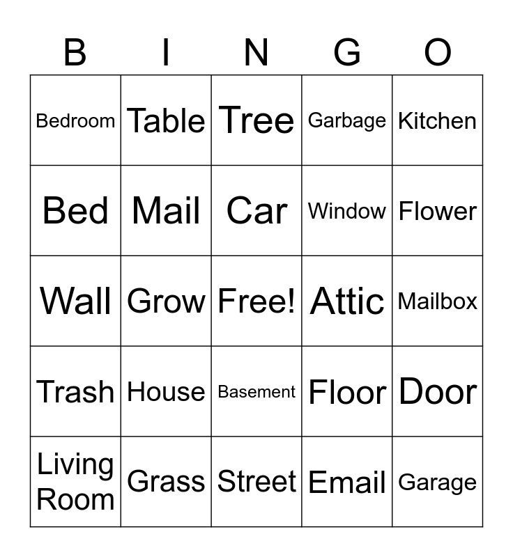 This bingo card has a free space and 24 words: House, Grass, Car, Living Room, Kitchen, Bedroom, Bed, Table, Attic, Basement, Window, Wall, Floor, Door, Mail, Email, Mailbox, Tree, Flower, Grow, Garage, Trash, Garbage and Street.