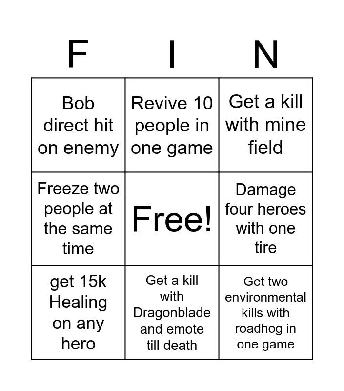 This bingo card has a free space and 8 words: Damage four heroes with one tire, Get a kill with mine field, Revive 10 people in one game, get 15k Healing on any hero, Bob direct hit on enemy, Get two environmental kills with roadhog in one game, Freeze two people at the same time and Get a kill with Dragonblade and emote till death.