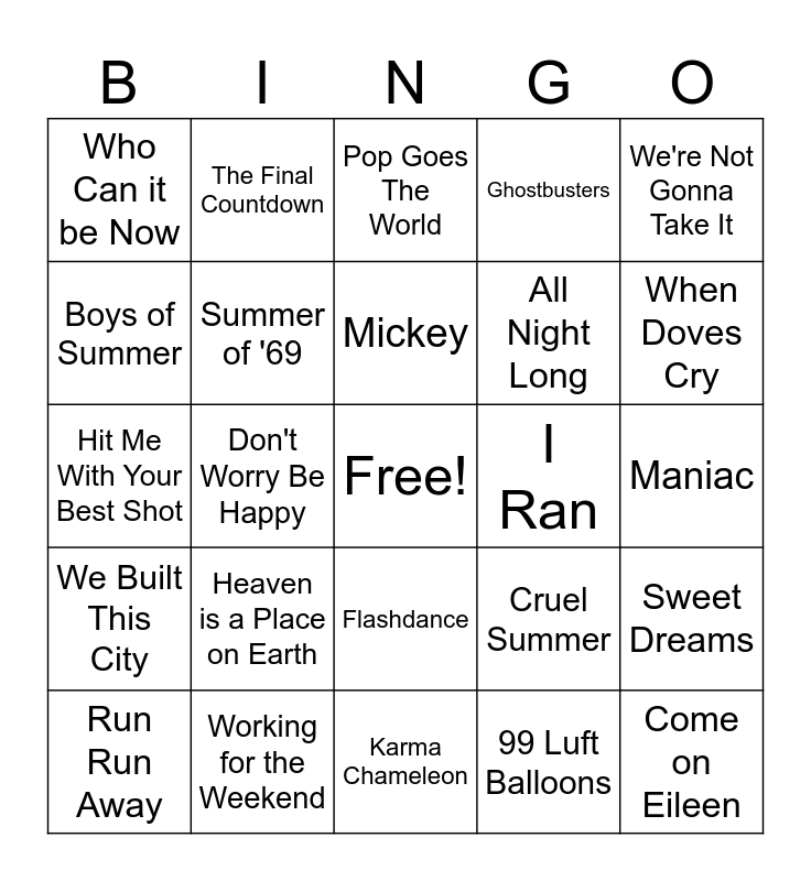 This bingo card has a free space and 50 words: 500 Miles, Come on Eileen, Wake Me Up Before You Go Go, Karma Chameleon, Heaven is a Place on Earth, Video Killed the Radio Star, The Final Countdown, Fame, Boys of Summer, Billie Jean, Summer of '69, Ghostbusters, Sweet Dreams, Cruel Summer, Total Eclipse of the Heart, Let's Hear it for the Boy, Mickey, I Ran, The Power, We're Not Gonna Take It, Don't Worry Be Happy, 99 Luft Balloons, Who Can it be Now, All Night Long, I Touch Myself, Safety Dance, When Doves Cry, The Look, Pop Goes The World, Flashdance, Cold as Ice, I Need a Lover, Money for Nothing, Simply Irresistible, Working for the Weekend, Material Girl, Sunglasses at Night, Shout, Head Over Heels, Maniac, I've Had the Time of my Life, Jessie's Girl, Africa, I Think We're Alone Now, Run Run Away, Hit Me With Your Best Shot, Ride on Time, Walk Like an Egyptian, We Built This City and Stars on 45 Medley.