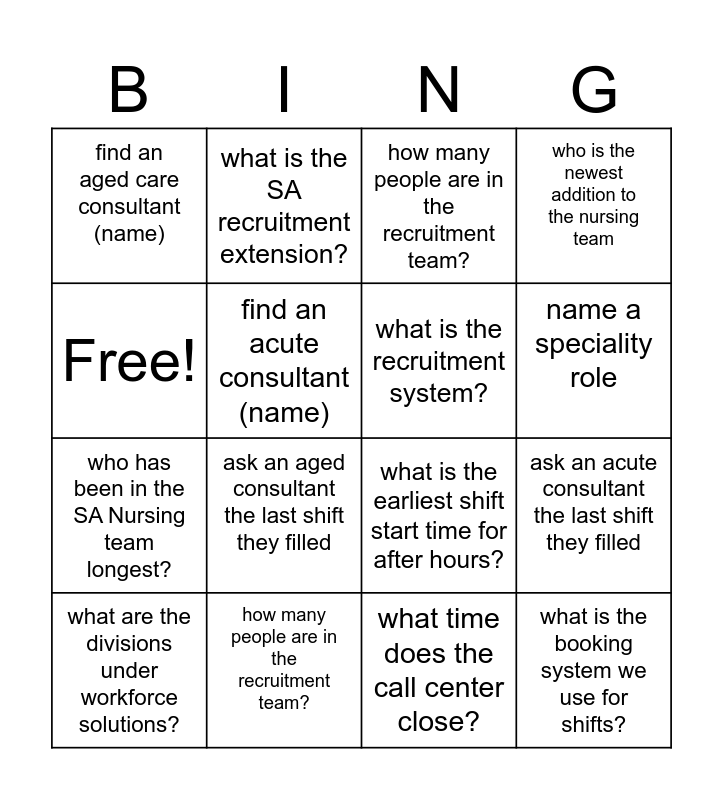 This bingo card has 16 words: how many people are in the recruitment team?, ask an acute consultant the last shift they filled, how many people are in the recruitment team?, find an aged care consultant (name), who has been in the SA Nursing team longest?, what is the SA recruitment extension?, what is the earliest shift start time for after hours?, what time does the call center close?, Free!, find an acute consultant (name), what are the divisions under workforce solutions?, who is the newest addition to the nursing team, ask an aged consultant the last shift they filled, name a speciality role, what is the recruitment system? and what is the booking system we use for shifts?.