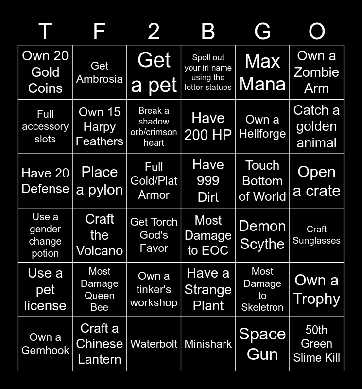 This bingo card has 36 words: Have a Strange Plant, Own a tinker's workshop, Minishark, Full accessory slots, Use a gender change potion, Have 999 Dirt, Own 15 Harpy Feathers, Waterbolt, Max Mana, Most Damage to Skeletron, Catch a golden animal, Spell out your irl name using the letter statues, Own a Trophy, Place a pylon, Have 200 HP, Own 20 Gold Coins, Use a pet license, Touch Bottom of World, Have 20 Defense, Get a pet, Full Gold/Plat Armor, Craft the Volcano, Most Damage to EOC, Get Torch God's Favor, Demon Scythe, Get Ambrosia, Own a Hellforge, Craft a Chinese Lantern, Break a shadow orb/crimson heart, Own a Zombie Arm, 50th Green Slime Kill, Own a Gemhook, Craft Sunglasses, Open a crate, Most Damage Queen Bee and Space Gun.