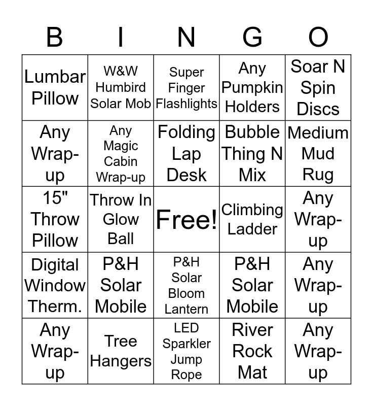 This bingo card has a free space and 24 words: P&H Solar Mobile, Tree Hangers, Folding Lap Desk, Any Wrap-up, Soar N Spin Discs, Lumbar Pillow, Any Wrap-up, W&W Humbird Solar Mob, Climbing Ladder, P&H Solar Bloom Lantern, Bubble Thing N Mix, 15" Throw Pillow, P&H Solar Mobile, Any Wrap-up, Any Magic Cabin Wrap-up, River Rock Mat, Any Wrap-up, Super Finger Flashlights, Medium Mud Rug, Throw In Glow Ball, Any Wrap-up, Digital Window Therm., Any Pumpkin Holders and LED Sparkler Jump Rope.