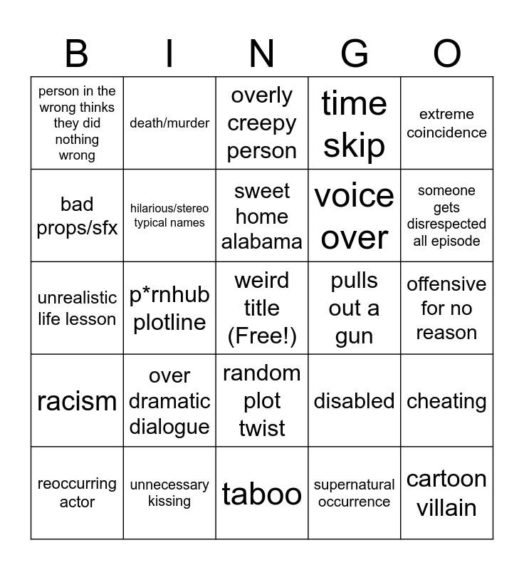 This bingo card has a free space and 24 words: over dramatic dialogue, unnecessary kissing, sweet home alabama, reoccurring actor, extreme coincidence, person in the wrong thinks they did nothing wrong, bad props/sfx, death/murder, pulls out a gun, random plot twist, voice over, unrealistic life lesson, disabled, cheating, hilarious/stereo typical names, supernatural occurrence, offensive for no reason, overly creepy person, someone gets disrespected all episode, p*rnhub plotline, cartoon villain, racism, time skip and taboo.