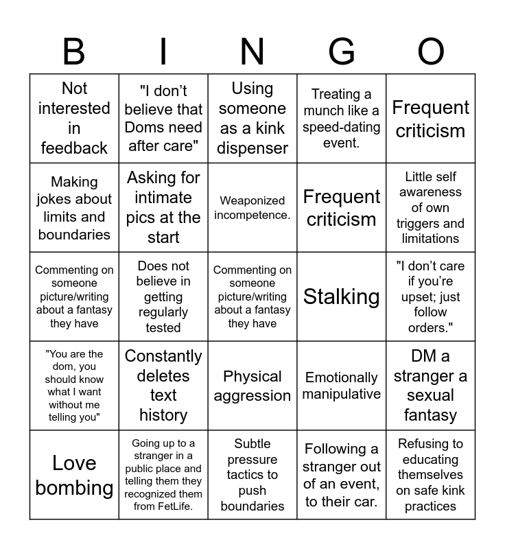 This bingo card has 39 words: Free!, "How dare you question me?", Lack of concern for emotional well-being, Asking for intimate pics at the start, Love bombing, Physical aggression, Weaponized incompetence., Inability to effectively apologize., Frequent criticism, "You are the dom, you should know what I want without me telling you", Does not believe in getting regularly tested, Treating a munch like a speed-dating event., Commenting on someone picture/writing about a fantasy they have, "I don’t care if you’re upset; just follow orders.", Stalking, Constantly deletes text history, Does not respect limits, Not interested in feedback, Wants to meet somewhere secluded in the first meet, Emotionally manipulative, Making jokes about limits and boundaries, Subtle pressure tactics to push boundaries, Frequent criticism, Little self awareness of own triggers and limitations, Invades privacy or oversteps personal boundaries, Neglecting safety precautions, Refusing to educating themselves on safe kink practices, Consenting Up during a scene, "You are the dom, you should know what I want without me telling you", "I don’t believe that Doms need after care", "I can have multiple partners, but you cannot", Does not believe in getting regularly tested, Using someone as a kink dispenser, Going up to a stranger in a public place and telling them they recognized them from FetLife., Following a stranger out of an event, to their car., Treating a munch like a speed-dating event., DM a stranger a sexual fantasy, Commenting on someone picture/writing about a fantasy they have and Trying to invalidate anyone's personal experience that led to a personal limit..