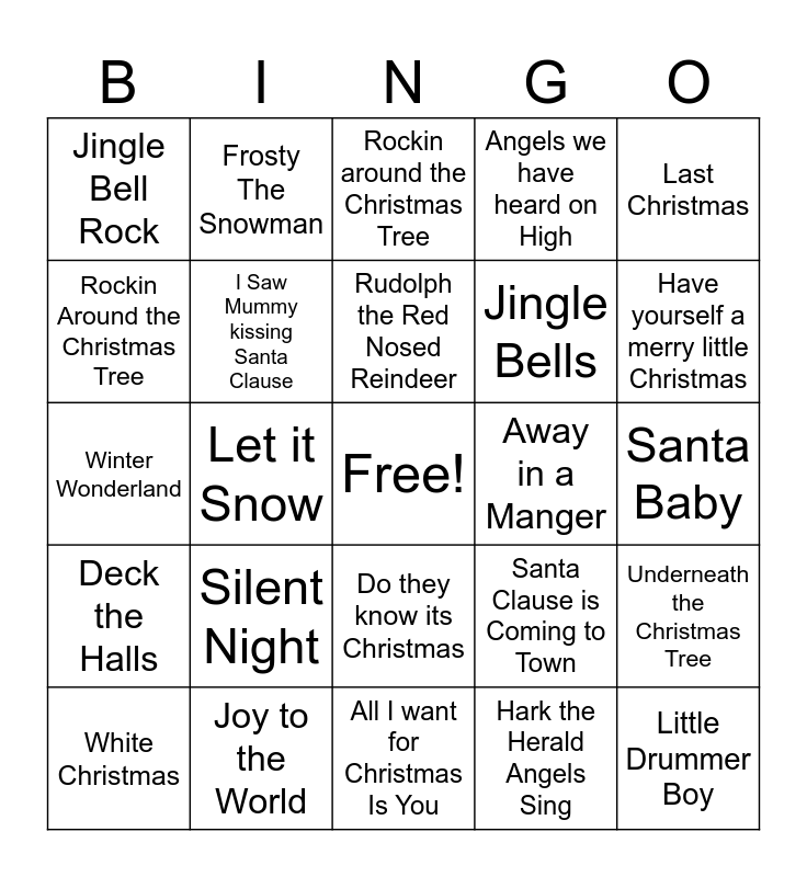 This bingo card has a free space and 25 words: Silent Night, All I want for Christmas Is You, Rudolph the Red Nosed Reindeer, White Christmas, Last Christmas, Jingle Bell Rock, Rockin Around the Christmas Tree, Frosty The Snowman, Away in a Manger, Do they know its Christmas, Jingle Bells, Winter Wonderland, Santa Clause is Coming to Town, Underneath the Christmas Tree, I Saw Mummy kissing Santa Clause, We wish you a merry christmas, Santa Baby, Rockin around the Christmas Tree, Have yourself a merry little Christmas, Let it Snow, Little Drummer Boy, Joy to the World, Deck the Halls, Angels we have heard on High and Hark the Herald Angels Sing.