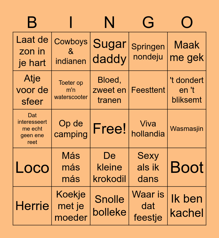 This bingo card has a free space and 75 words: Huis feestje, Zoet, Zout, Zuur, Sugar daddy, Engelen gezang, Lucht ballon, Engel bewaarder, Vanavond (uit m'n bol), Ik ga zwemmen, Mooie dag, Bon gepakt, Als de morgen is gekomen, Links rechts, Bloed, zweet en tranen, Atje voor de sfeer, Frans duits, Op de camping, Ferry de roze flamingo, Ik ben kachel, Heb je even voor mij, Maak me gek, Oya lélé, Dat interesseert me echt geen ene reet, Toeter op m'n waterscooter, Cowboys & indianen, Springen nondeju, Ik moet zuipen, Beauty & de brains, Boten anna, Adreline, Tomaten plukkers, Europapa, Vrouwkes, Bagage drager, Sexy als ik dans, 't dondert en 't bliksemt, Feesttent, Kom van het dak af, Helemaal naar de klote, Wasmasjin, Waar is dat feestje, Gabbertje, Sterrenstof, Weekend, Schudden, Liever te dik in de kist, Kali, Herrie, Laat de zon in je hart, Shirt uit & zwaaien, Alle kleuren, Belgie, De kleine krokodil, Helikopter, Ik tel tot 3, Het is altijd lente in de ogen van de tandarts assistente, Ik heb hele grote bloemkoole, Een hete nacht in de koelcel, Praat westlands met me, Kind van een tuinder, Amsterdam, Más más más, Pepas, Pa olvidarte, Jij bent de zon, Alles of niets, Viva hollandia, Zon op m'n piemel, Schatje mag ik je foto, Toppertje, Boot, Loco, Koekje met je moeder, Duurt te lang, Snolle bolleke and Boom boom bailando.