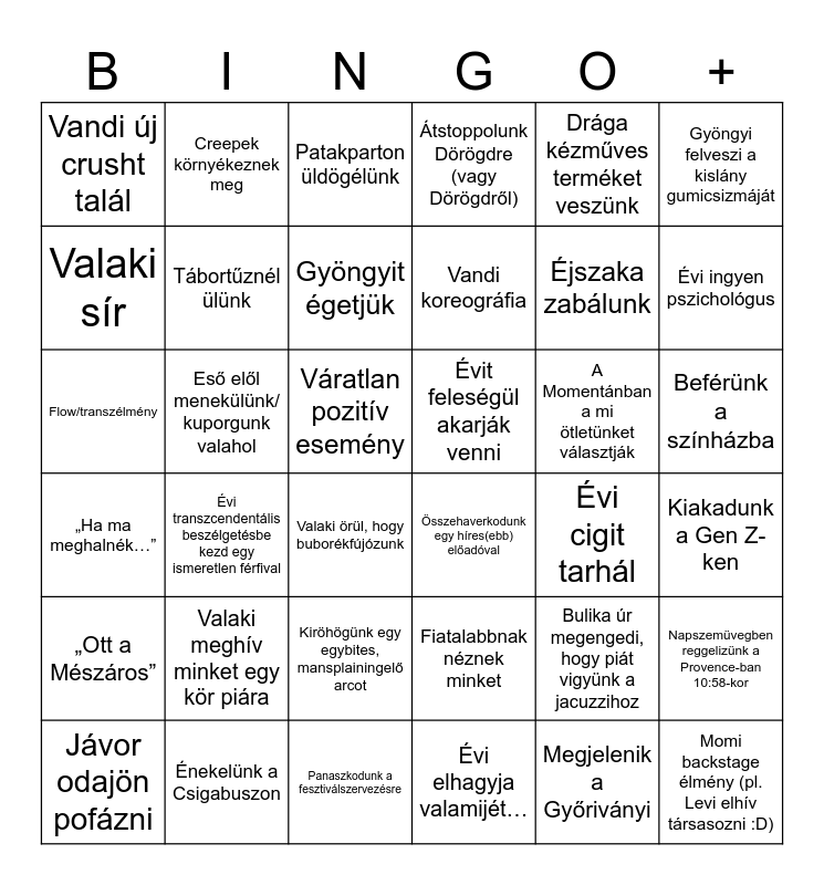 This bingo card has 36 words: Fiatalabbnak néznek minket, Kiröhögünk egy egybites, mansplainingelő arcot, Évi elhagyja valamijét…, Valaki sír, „Ha ma meghalnék…”, Évit feleségül akarják venni, Tábortűznél ülünk, Panaszkodunk a fesztiválszervezésre, Drága kézműves terméket veszünk, Bulika úr megengedi, hogy piát vigyünk a jacuzzihoz, Évi ingyen pszichológus, Átstoppolunk Dörögdre (vagy Dörögdről), Napszemüvegben reggelizünk a Provence-ban 10:58-kor, Eső elől menekülünk/ kuporgunk valahol, Vandi koreográfia, Vandi új crusht talál, „Ott a Mészáros”, A Momentánban a mi ötletünket választják, Flow/transzélmény, Patakparton üldögélünk, Váratlan pozitív esemény, Évi transzcendentális beszélgetésbe kezd egy ismeretlen férfival, Összehaverkodunk egy híres(ebb) előadóval, Valaki örül, hogy buborékfújózunk, Évi cigit tarhál, Creepek környékeznek meg, Éjszaka zabálunk, Énekelünk a Csigabuszon, Gyöngyit égetjük, Gyöngyi felveszi a kislány gumicsizmáját, Momi backstage élmény (pl. Levi elhív társasozni :D), Jávor odajön pofázni, Kiakadunk a Gen Z-ken, Beférünk a színházba, Valaki meghív minket egy kör piára and Megjelenik a Győriványi.