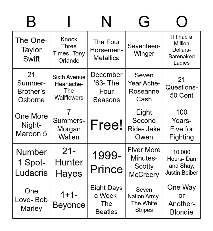 This bingo card has a free space and 86 words: The Edge of Seventeen- Stevie Nicks, I’m Gonna Be (500 Miles)- The Proclaimers, 1999- Prince, 99 Red Balloons- Nena, Eight Days a Week- The Beatles, 9 to 5- Dolly Parton, Summer of ’69- Bryan Adams, 1979- Smashing Pumpkins, 2 Princes- Spin Doctors, A Thousand Years- Christina Perri, 3AM- Matchbox 20, 18 and Life- Skid Row, 10,000 Hours- Dan and Shay, Justin Beiber, 100 Years- Five for Fighting, Cloud Number 9- Bryan Adams, December ’63- The Four Seasons, Down to 1- Luke Bryan, 8 Mile- Eminem, It Takes 2- Rob Base and E-Z Rock, Mambo No 5- Lou Bega, Nothing Compares 2 U- Sinead O’Connor, Two of Us- The Beatles, One More Night- Maroon 5, Seven Bridges Road- Eagles, Seven Nation Army- The White Stripes, 16 Tons- Tennessee Ernie Ford, Three Little Birds- Bob Marley, Three Time a Lady- The Commodores, Two Tickets to Paradise- Eddie Money, 1, 2 Step- Ciara, 1+1- Beyonce, I Can’t Drive 55- Sammy Hagar, 1000 Horsepower- Godsmack, 21- Hunter Hayes, 21 Summer- Brother’s Osborne, 4x4xU- Lainey Wilson, 21 Questions- 50 Cent, 5150- Dierks Bentley, 7 Minutes in Heaven- Fall Out Boy, 7 Summers- Morgan Wallen, 72 Seasons- Metallica, 99 Bottles of Beer, Better Dig 2- The Band Perry, Eight Second Ride- Jake Owen, Eighteen Yellow Roses- Bobby Darin, If I had a Million Dollars- Barenaked Ladies, It’s Five O’Clock Somewhere- Alan Jackson, Knock Three Times- Tony Orlando, Back at One- Brian McKnight, 1000 Nights- Ed Sheeran, Ten Thousand Fists- Disturbed, Nine Lives- Def Leppard, Number 1 Spot- Ludacris, One- U2, One Margarita- Luke Bryan, One Mississippi- Kane Brown, Seven- Dave Mathews Band, Seven Year Ache- Roseanne Cash, Seventeen- Winger, Sixth Avenue Heartache- The Wallflowers, The One- Taylor Swift, Two Ghosts- Harry Styles, 2 Become 1- Spice Girls, Year 3000- Jonas Brothers, Jenny (867-5309)- Tommy Tutone, The Four Horsemen- Metallica, Another One Bites the Dust- Queen, One Way or Another- Blondie, One is the Loneliest Number- Three Dog Night, Love Potion Number Nine- Clovers, The One I Love- REM, Sixteen Candles- The Crests, One Love- Bob Marley, One More Night- Phil Collins, 24k Magic- Bruno Mars, Fifteen- Taylor Swift, Eight Days a Week- The Beatles, Six Feet Under- The Weeknd, One of These Days- Pink Floyd, Two Out of Three Ain’t Bad- Meatloaf, Sk8ter Boy- Avril Lavigne, 911- Lady Gaga, 1985- Bowling for Soup, 99 Problems- Jay-Z, Fiver More Minutes- Scotty McCreery and 80’s Mercedes- Maren Morris.