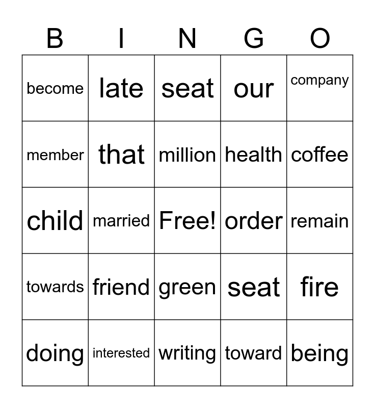 This bingo card has a free space and 24 words: friend, interested, million, doing, company, become, member, late, order, green, health, child, seat, fire, that, toward, remain, seat, coffee, married, being, towards, our and writing.