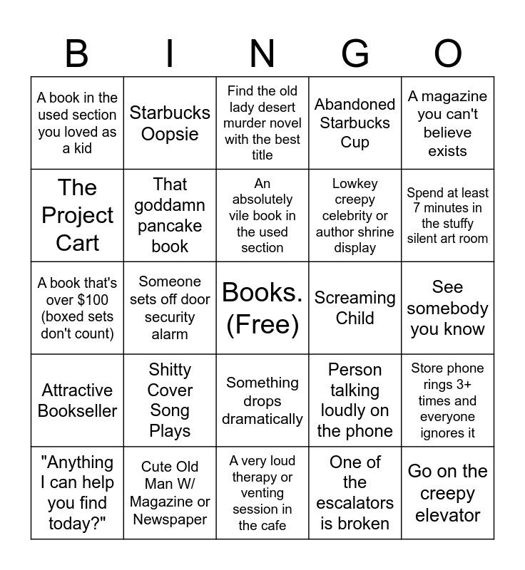 This bingo card has a free space and 24 words: Shitty Cover Song Plays, Cute Old Man W/ Magazine or Newspaper, An absolutely vile book in the used section, "Anything I can help you find today?", A magazine you can't believe exists, A book in the used section you loved as a kid, The Project Cart, Starbucks Oopsie, Screaming Child, Something drops dramatically, Lowkey creepy celebrity or author shrine display, A book that's over $100 (boxed sets don't count), Person talking loudly on the phone, Store phone rings 3+ times and everyone ignores it, That goddamn pancake book, One of the escalators is broken, See somebody you know, Find the old lady desert murder novel with the best title, Spend at least 7 minutes in the stuffy silent art room, Someone sets off door security alarm, Go on the creepy elevator, Attractive Bookseller, Abandoned Starbucks Cup and A very loud therapy or venting session in the cafe.