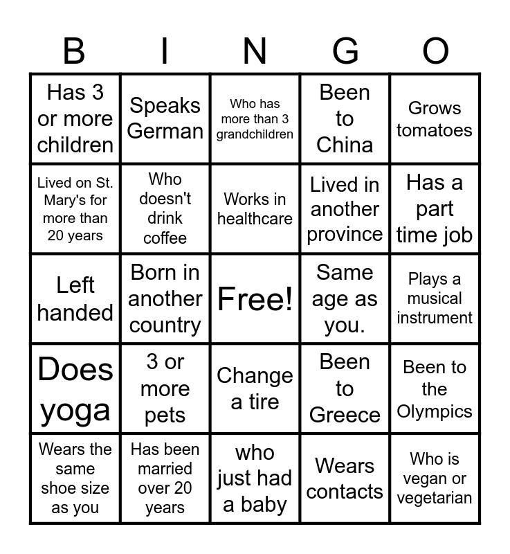 This bingo card has a free space and 29 words: Wears the same shoe size as you, Speaks French, Born in another country, Who has met someone famous, Has 3 or more children, Who has more than 3 grandchildren, Who doesn't drink coffee, 3 or more pets, Same age as you., Has been married over 20 years, Plays a musical instrument, Who is vegan or vegetarian, who just had a baby, Wears contacts, Has a part time job, Wearing pink, Change a tire, Does yoga, Grows tomatoes, Left handed, Been to Greece, Plays hockey, Lived in another province, Lived on St. Mary's for more than 20 years, Been to China, Speaks German, Been to the Olympics, Works in healthcare and Working on the new battery plant.