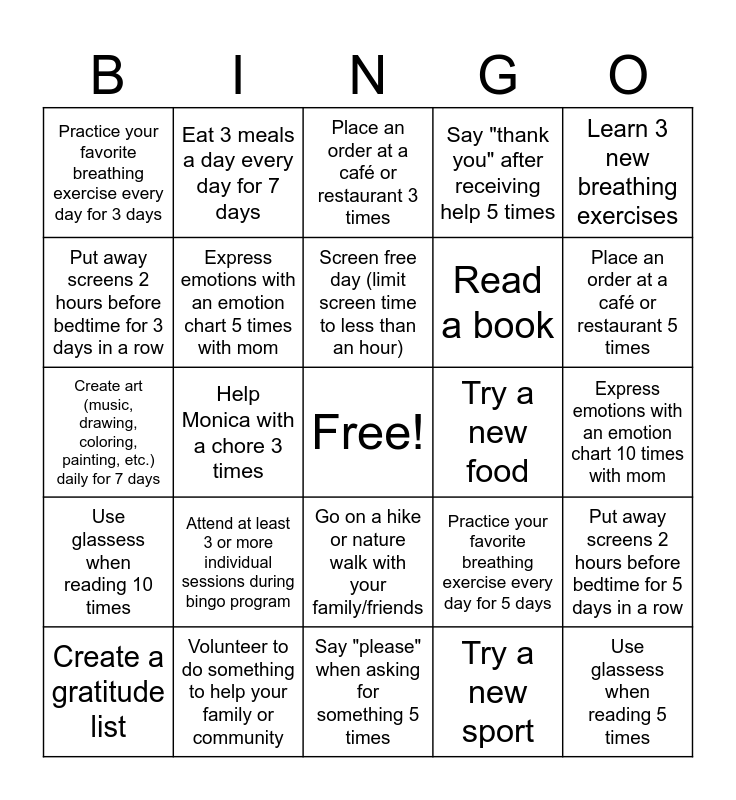 This bingo card has a free space and 24 words: Attend at least 3 or more individual sessions during bingo program, Volunteer to do something to help your family or community, Screen free day (limit screen time to less than an hour), Create a gratitude list, Learn 3 new breathing exercises, Practice your favorite breathing exercise every day for 3 days, Put away screens 2 hours before bedtime for 3 days in a row, Eat 3 meals a day every day for 7 days, Try a new food, Go on a hike or nature walk with your family/friends, Read a book, Create art (music, drawing, coloring, painting, etc.) daily for 7 days, Practice your favorite breathing exercise every day for 5 days, Put away screens 2 hours before bedtime for 5 days in a row, Express emotions with an emotion chart 5 times with mom, Try a new sport, Express emotions with an emotion chart 10 times with mom, Place an order at a café or restaurant 3 times, Place an order at a café or restaurant 5 times, Help Monica with a chore 3 times, Use glassess when reading 5 times, Use glassess when reading 10 times, Say "thank you" after receiving help 5 times and Say "please" when asking for something 5 times.